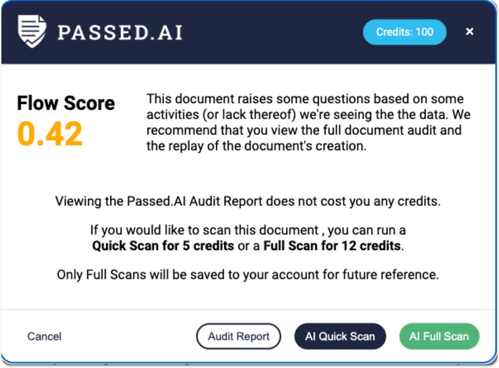 It’s decision time! After clicking ‘Passed.AI Report’, you’ll be prompted to choose whether you’d like to see the Audit Report first or if you’d like to go ahead with one of the AI scans. The AI Quick Scan requires less credits, but also just scans a part of the text. The AI Full Scan uses Originality.AI and offers 99% accuracy.
