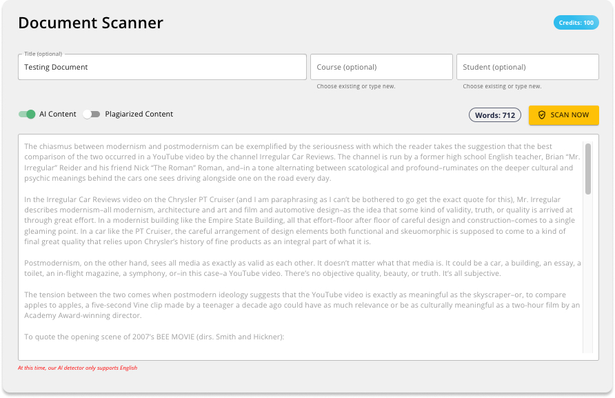The optional fields in the top row have the main purpose to organize your scan history which can be viewed in your profile. Choose whether you’d like an AI Content scan, a Plagiarism scan, or both. For an input of 100 words, each scan will cost 1 credit. Keep in mind that if you opt to do both scans, it’ll be 2 credits. Hit ‘Scan Now’ to continue!